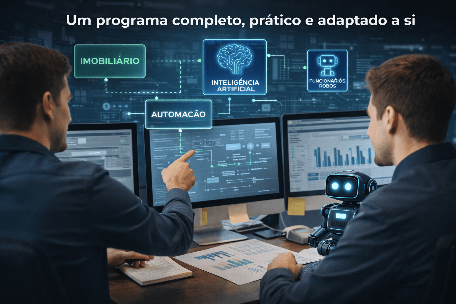 Das bases do imobiliário à Automação, IA e +100 Funcionários Robôs, aprende a construir um negócio moderno, eficiente e escalável, com processos testados.